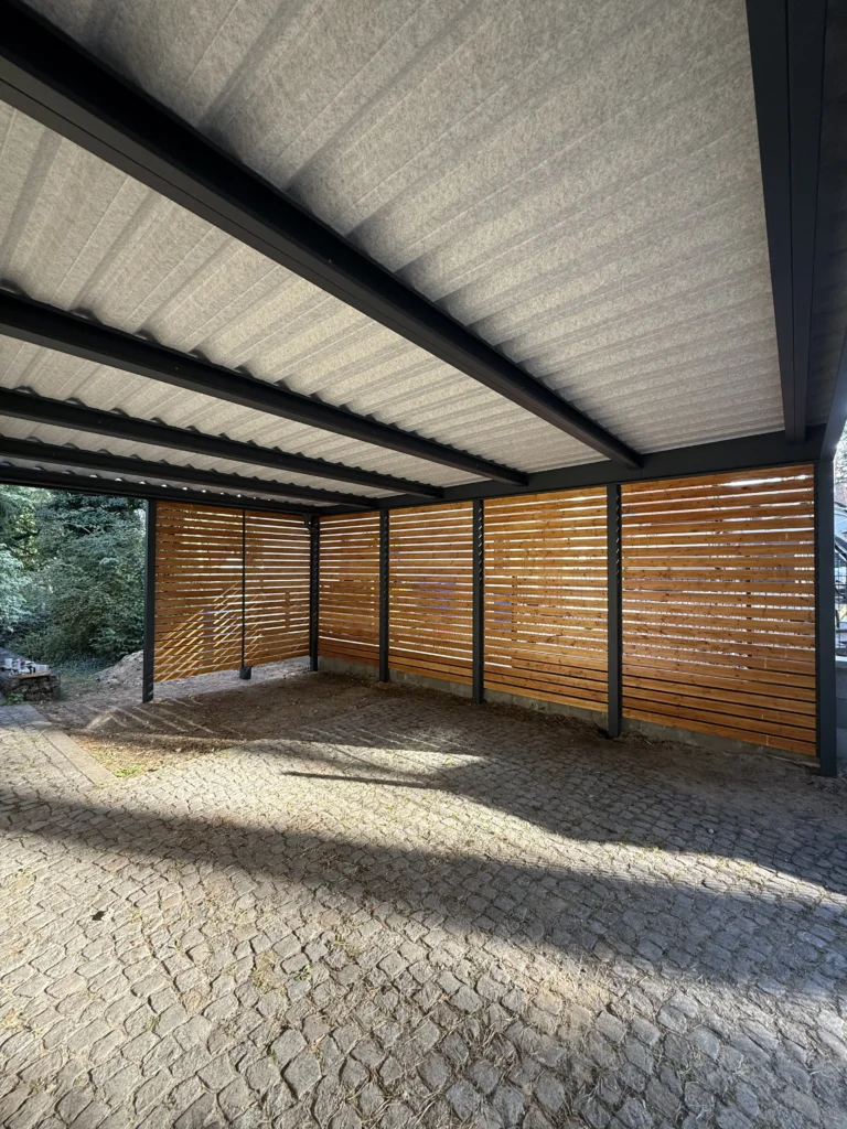 Wir analysierten die Situation vor Ort und empfahlen eine maßgeschneiderte Lösung: Ein freitragendes Doppelcarport mit einer geschlossenen Rückwand und einer seitlichen Lamellenwand. Die Lamellen wurden im exakten RAL-Farbton der Fensterrahmen des Wohnhauses pulverbeschichtet (RAL 7016, Anthrazitgrau). Dies sorgte für ein harmonisches Gesamtbild.