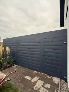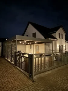 Bei diesem Projekt haben wir einen modernen Metall-Carport nach Maß gefertigt, der individuell an die Wünsche des Kunden angepasst wurde und mit integrierter LED-Beleuchtung für hohen Nutzungskomfort sorgt. Die Farbgebung wurde passend zu Fenstern und Haustür des Gebäudes gewählt – in diesem Fall im Farbton RAL 7039 FS, wodurch ein harmonisches und elegantes Gesamtbild entsteht. Zusätzlich wurde eine passende Zaunanlage mit automatischem Einfahrtstor montiert, sodass eine sichere und funktionale Lösung für das gesamte Grundstück realisiert wurde. Hochwertige Materialien, präzise Verarbeitung und professionelle Montage garantieren ein langlebiges Ergebnis.