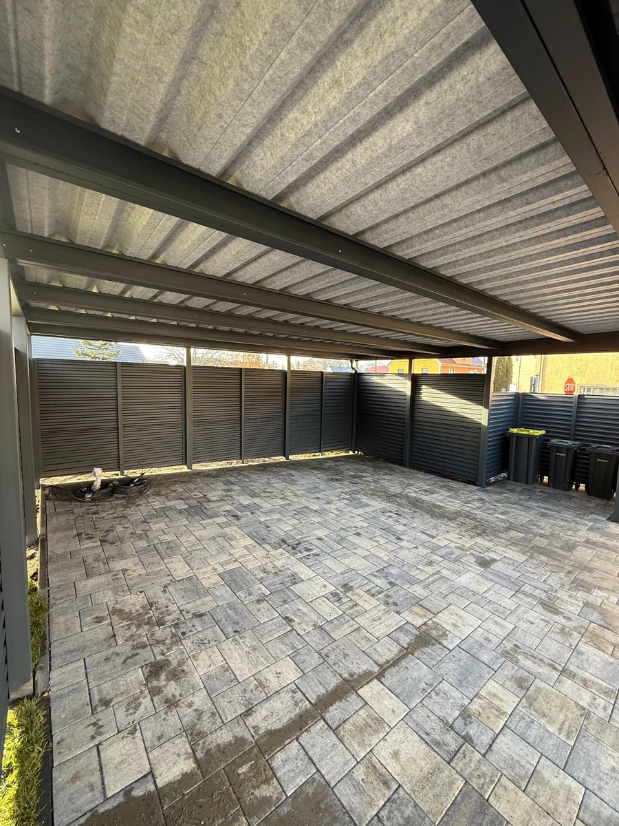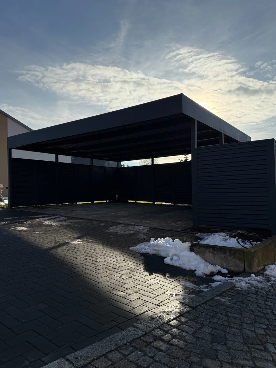 Die 40 cm breiten Blenden betonen das zeitgemäße Design und verleihen dem Carport eine leichte, elegante Optik. Ideal für alle, die Wert auf Design, Langlebigkeit und Stil im Alltag legen.