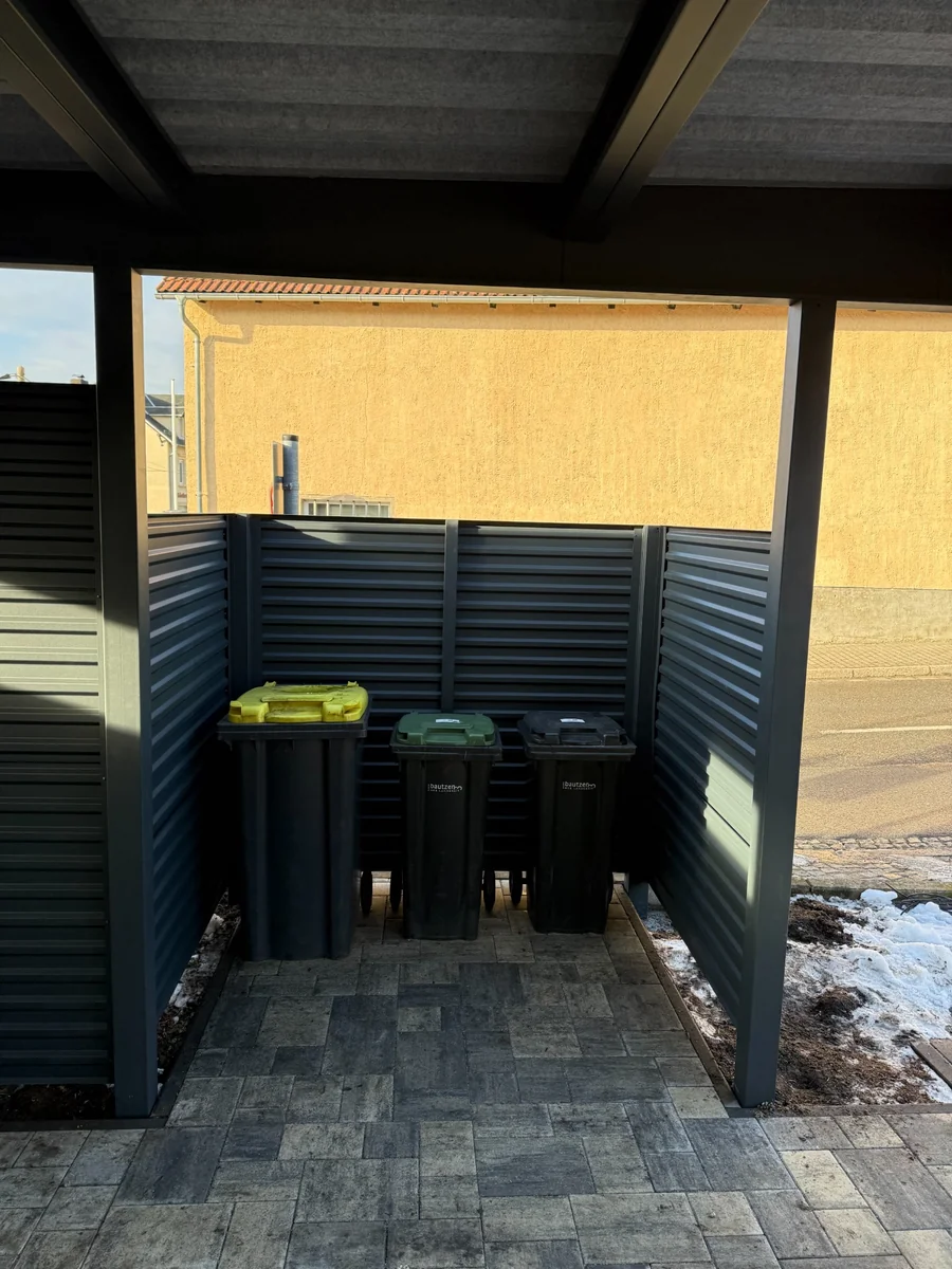 Metall-Carport nach Maß in RAL 7016 FS mit integriertem Mülltonnenbereich