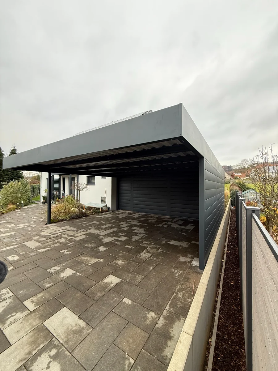 Moderner Metall-Carport nach Maß in RAL 7016 FS, perfekt auf den Stil des Hauses abgestimmt. Seitliche Sichtschutzelemente sorgen für mehr Komfort und Privatsphäre, während der integrierte Mülltonnenbereich für Ordnung und ein gepflegtes Erscheinungsbild sorgt.