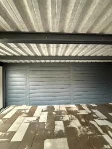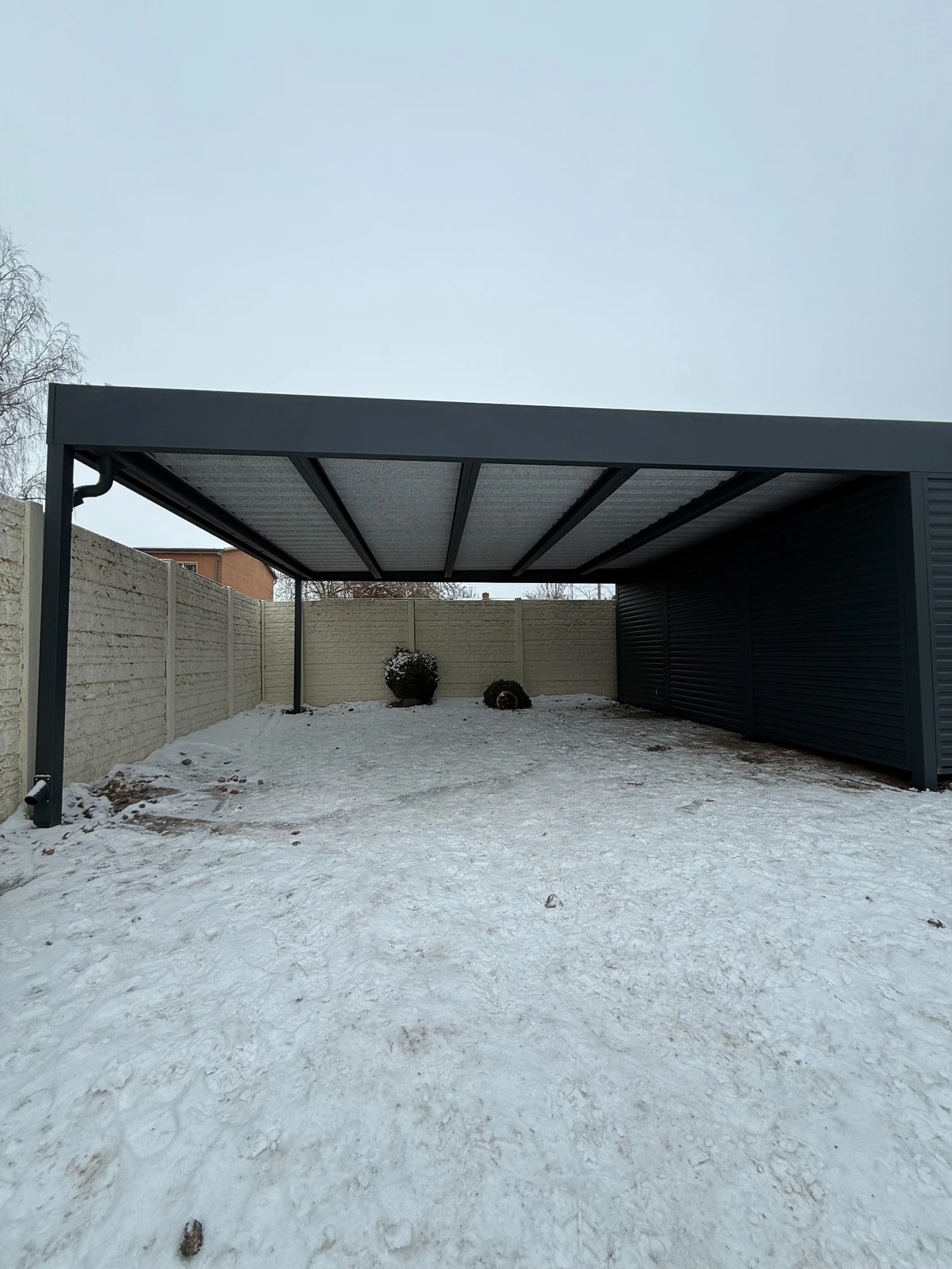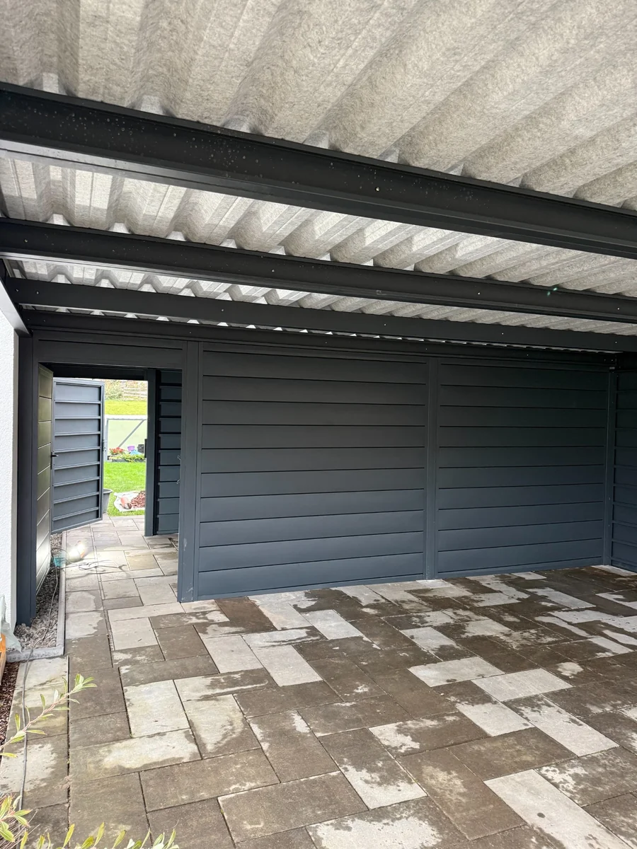 Moderner Metall-Carport nach Maß in RAL 7016 FS, optisch abgestimmt auf Haus und Zaunanlage. In die Konstruktion wurde ein praktischer Schuppen mit zwei Zugängen von beiden Seiten integriert, was den Komfort im Alltag deutlich erhöht. Für Wände und Schuppen kam langlebiges Trapezblech PEG 2/215 zum Einsatz, das für Stabilität und ein modernes Erscheinungsbild sorgt.