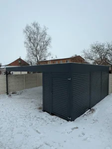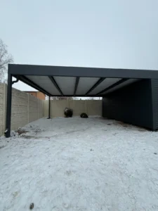 Moderner Metall-Carport nach Maß in den Abmessungen 8 × 6 m, ausgeführt in der Farbe RAL 7016 FS (matt). Integriert wurde ein praktischer Abstellraum (2 × 6 m) mit einem Zugang. Für die Verkleidung wurde Profilblech TRB14 verwendet, das für Stabilität, Langlebigkeit und eine hochwertige Optik sorgt.