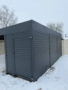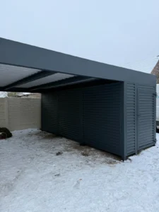 Metalowa wiata samochodowa na wymiar w kolorze RAL 7016 FS ze zintegrowanym koszem na śmieci