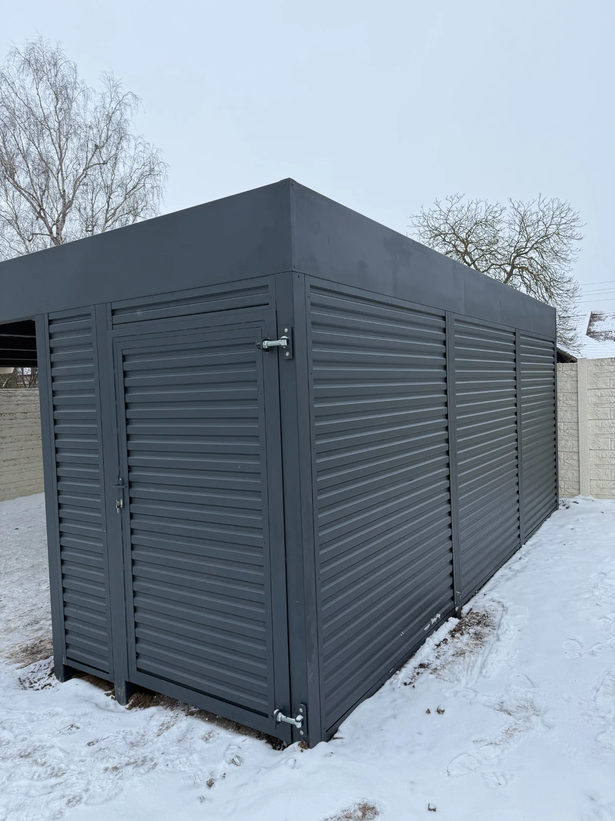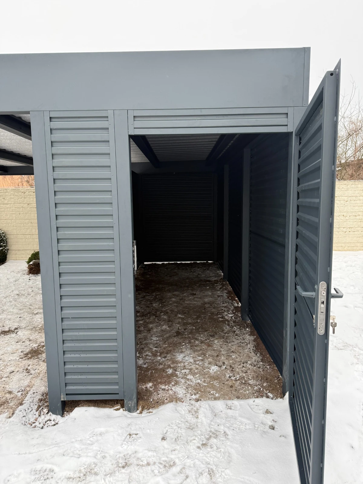Metall-Carport nach Maß in RAL 7016 FS mit Schuppen und zwei Zugängen