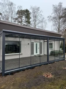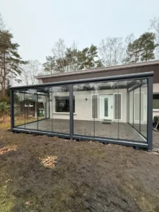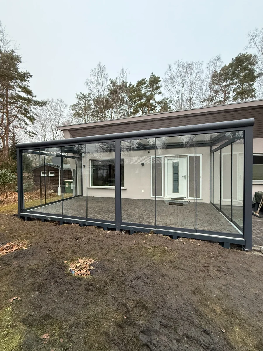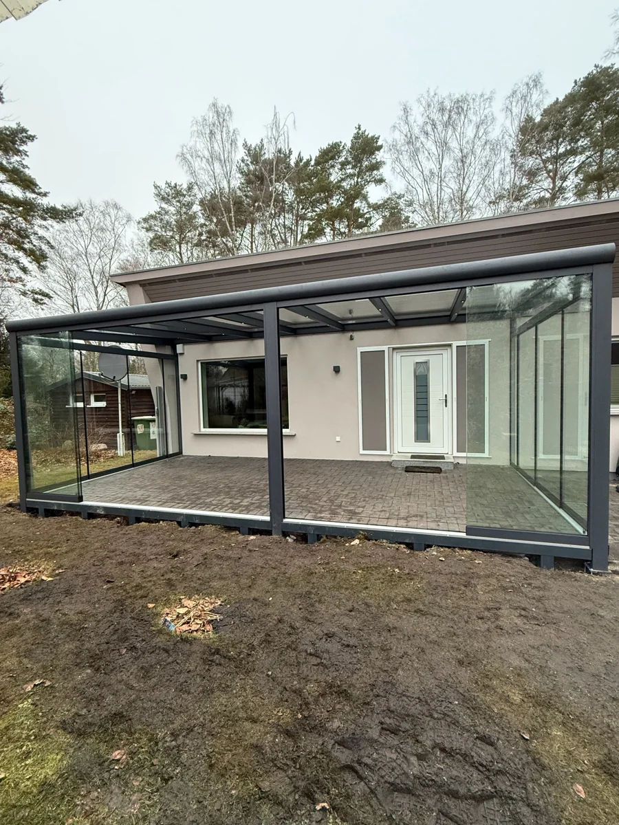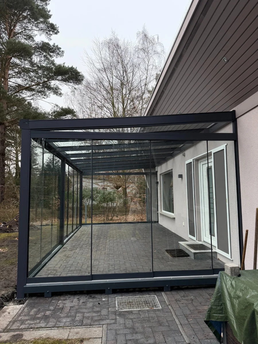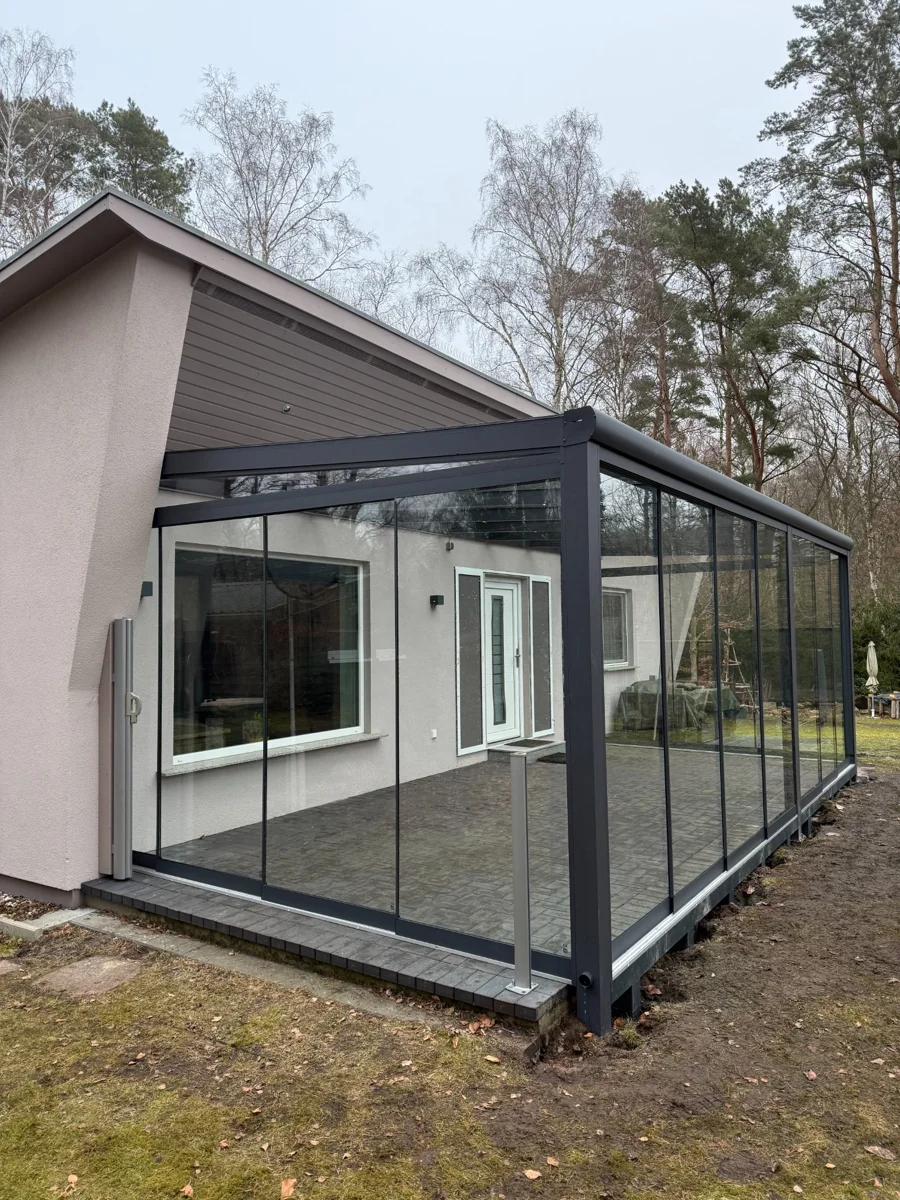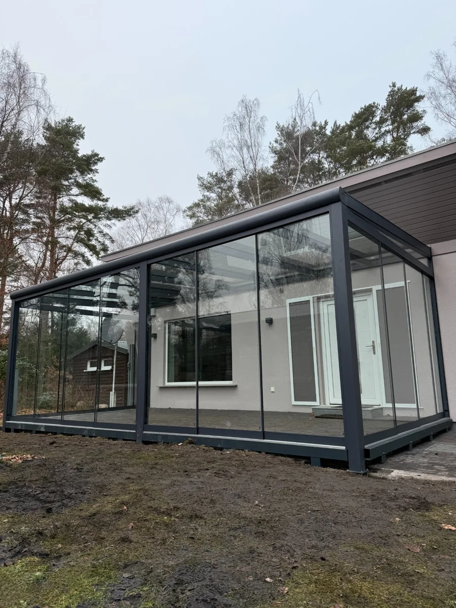 Moderner Wintergarten aus Aluminium in RAL 7016 matt. Die Konstruktion ist mit vollständig verschiebbaren Glasschiebewänden ausgestattet, die maximale Offenheit sowie Schutz vor Wind und Regen bieten. Zusätzlich sorgt die integrierte LED-Beleuchtung für hohen Komfort und eine angenehme Atmosphäre am Abend.