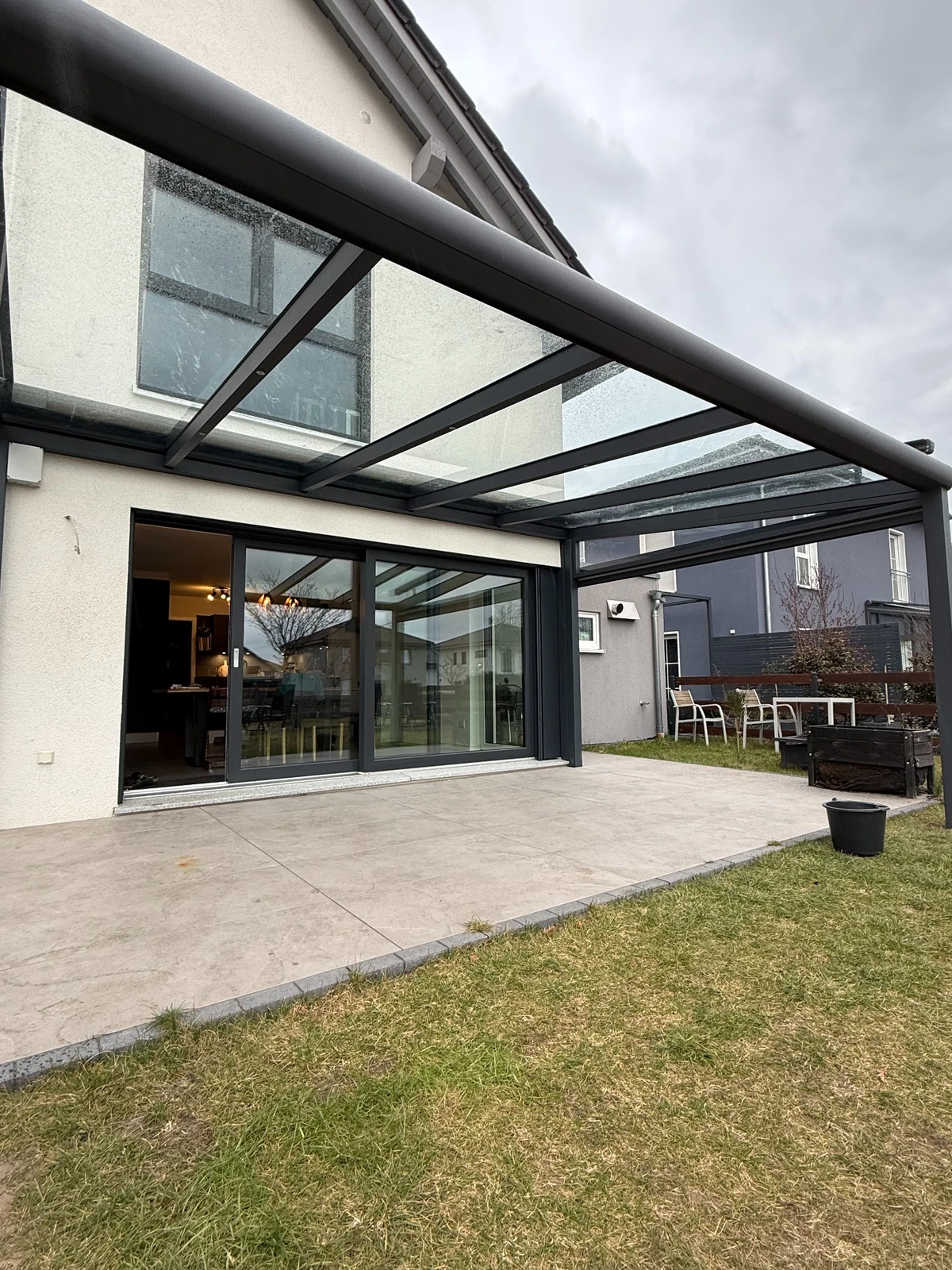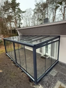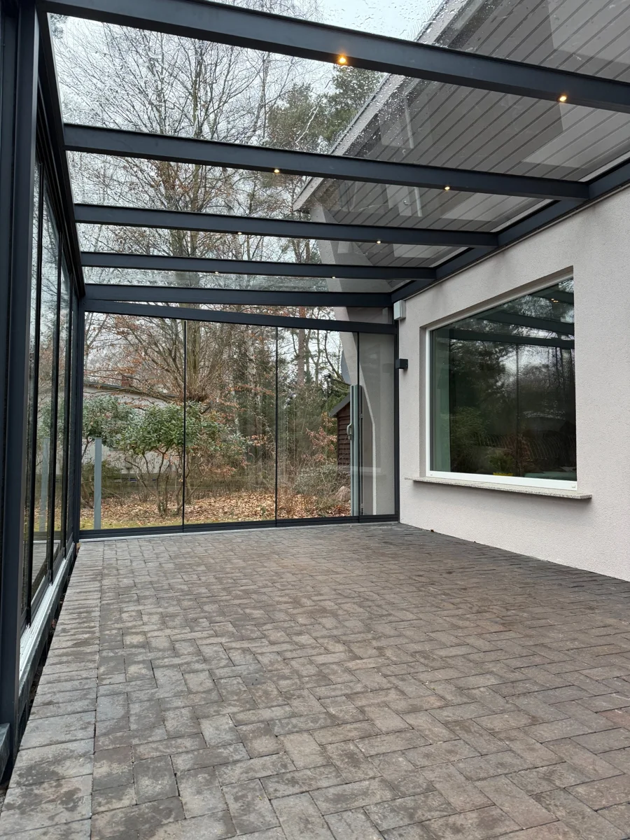 Wintergarten aus Aluminium RAL 7016 matt – Terrassenüberdachung mit Glasschiebesystem und LED-Beleuchtung
